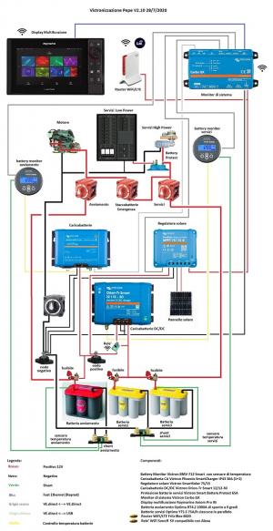 Ecco il nuovo schema con il router LTE Fritz!box 6820 che ha sostituito la "saponetta" precedente ed il primo switch che permette di commutare il pannello solare dalla batteria motore a quella servizi. Il router Fritz, a prezzo di un consumo leggermente superiore alla saponetta e dell'assenza della batteria tampone, ha una affidabilita' ed una flessibilita' sicuramente superiori. Una routine di Alexa spegne il Cerbo GX e l'Echo Input un'ora prima del tramonto e li riaccende alle 8 del mattino per risparmiare corrente. Nel caso abbia bisogno di intervenire posso comunque accendere il Cerbo in ogni momento. Il consumo medio e' passato da 0,3 A/h con la saponetta a 0,4 A/h con il Fritz. La batteria perde circa il 4% della sua SOC durante la notte, ma dopo meno di un paio d'ore ritorna al 100% grazie al pannello solare.