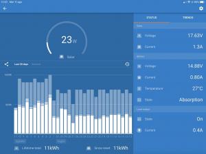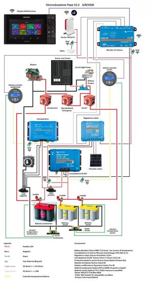 La "storia" dello SmartSolar evidenzia il maggior consumo notturno del sistema, da 0,3 a 0,4 A/h. La fase bulk si prolunga ed il pannello produce leggermente di piu' come si vede dalla immagine. Nel frattempo il sistema batterie della barchetta e' completato ed anche lo schema, comprendendo i rele' wifi della Sonoff che consentono di disattivare i caricabatterie Phoenix IP43, Orion TR, il Cerbo GX e l'echo Input che consente di utilizzare Alexa a bordo. I rele' sono stati posti in scatole con coperchio trasparente per poter controllare lo stato del rele' stesso. Devo solo fascettare il cablaggio e poi il lavoro e' finalmente concluso.