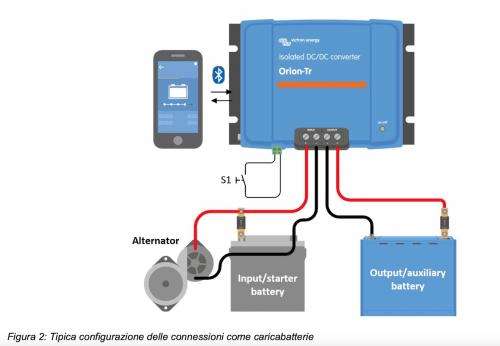 1) Caricabatterie 220 V solo su banco servizi (CB220 dedicato) e ottimizzato per la chimica del banco. Se hai un CB220 che ha anche un'uscita per la batteria motore come il mio ottimo, ma vecchio, Victron Atlas Combi questa uscita, tipicamente più' fine, ex. 4 mmq, la attacchi alla batteria motore altrimenti, meglio pensare ad un semplice ulteriore CB 220 dedicato aggiuntivo, anche da pochi Ampere (quindi pochi Euro) che sara' a questo punto ottimizzato per la chimica corretta (probabilmente sempre piombo AGM che in futuro potrebbe differire dal banco servizi perche' magari installeremo un BS lifePo4). Tipicamente comunque, tutti ci facciamo delle gran pippe mentali ma la batteria motore non avrebbe normalmente bisogno di un caricabatterie e, se le presenze in barca sono diciamo ca. mensili, e' possibile farne tranquillamente a meno. Nel caso invece che la batteria motore abbia (cosi' ci mettiamo a posto la coscienza) un'altra fonte ricarica 220V oltre alternatore, per evitar problemi di "attivazioni" indesiderate, e' possibile ed opportuno gestire lo switch S1 di consenso al "+12V" del quadro motore (sotto chiave). Vedi allegato 1. Ho aggiunto un secondo allegato, per far vedere meglio come Victron ha dato ampia possibilità' di gestire attivazione Orion (come puro switch, sul +12 sotto chiave, etc.)