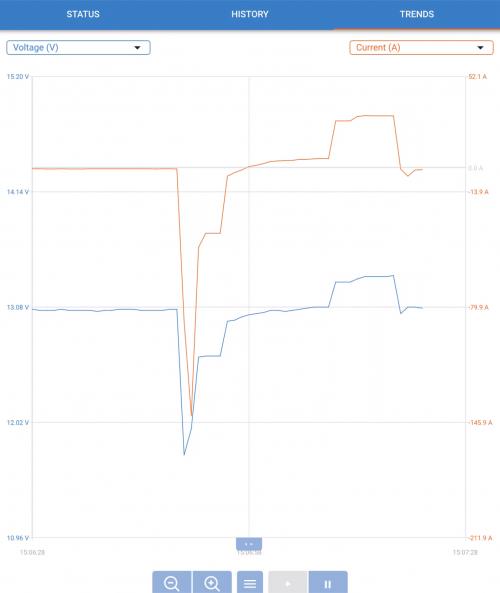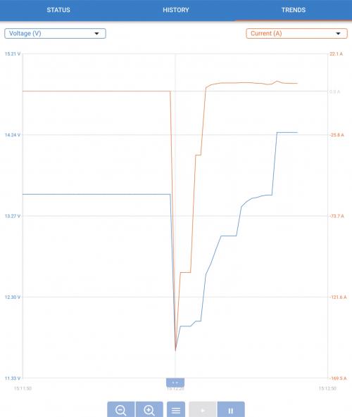 La messa in servizio della nuova batteria Victron è terminata, finalmente. I test per la gestione dell’undercharge ed overcharge sono stati positivi, così come l’avviamento in emergenza del motore con la batteria servizi. Le 2 immagini allegate mostrano il voltaggio e gli ampere utilizzati per l’avviamento a freddo del motore in emergenza con la batteria lfp e poi con la Optima Red Top. Anche il problema dell’allarme di bassa tensione sembra essere risolto. Sto fascettando ed etichettando i cavi; devo anche rimuovere il battery protect che non serve più a nulla, visto che il suo mestiere lo fa il bms. Manca poco a dichiarare chiuso il cantiere.
