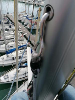 Per le vele nuove in arrivo, randa e genoa in dacron fibrato Dynnema, code 65 in poliestere cableless su avvolgitore custom in carbonio, gennaker con calza di 144 mq (usato) sono stati fatti importanti lavori sull’attrezzatura velica. In particolare golfare e scatola drizza per la 2:1 in t.a. su disegno e quote fornite dalla Selden, drizza gennaker/code Benvenuti SK 78 Cruise in dyneema con moschettone Wichard Speedlink, tratto posteriore delle borose in dyneema Glestein Mega Twin da 10 mm., bozzelli per le scotte gennaker/code montati su contropiastre in alluminio 10x10 cm , sostituiti i rinvii piani doppi ( scotta randa e scotta genoa) con rinvii Selden con stopper per liberare i winch lasciando le scotte sotto carico , sostituiti i rinvii piani delle cime di regolazione dei carrelli genoa con analoghi rinvii singoli con stopper in sostituzione dei Rutgeson precedenti che avevano gli stopper mal progettati e soggetti a liberarsi autonomamente. I 14 stopper in tuga adesso hanno tutte le manovre operative, compreso mura gennaker che esce dalla parte posteriore del bompresso Selden, e seconda drizza spi in t.a. Rimane fuori solo la cima del freno antistrambata. La staffa originale del bompresso è stata modificata per far si che lo stesso, quando esteso, non interferisca con l’arco dell’ancora Rocna. Sul bompresso viene murato i gennaker, mentre il code che necessita di controventatura per la maggior tensione di drizza applicata, viene murato sulla delfiniera. Per lanciare e riporre con facilità gennaker e code ho installato cerniere , ponticelli, elastici sui pianali delle cuccette di prua. Si possono tenere aperti assieme ai materassi, le vele che normalmente stanno riposte nei gavoni sottostanti, quando in navigazione, le tengo legate ad una maniglia a ventosa attaccata sull’ interno dell’osteriggio. Basta aprire dall’ esterno l’osteriggio e si hanno disponibili le penne delle due vele.