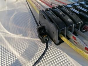 Insieme alla trinchetta che mancava e che finalmente è stata realizzata in dacron cross cut, con i garrocci in tessile e la bugna alta, da 18 mq, mi sono ingegnato per trovare soluzioni accettabili per poter gestire le ulteriori due scotte della trinchetta, collegare alla coperta le volanti in posizione d'uso e di riposo, gestire il code 60 dal pozzetto con il loop lungo. Per le scotte ho montato dei rinvii Selden con strozzatore per poter magari avere le due vele entrambe in uso contemporaneo gestite da un unico winch. Alcune cose provate alcune no dato che la zona gialla che consente di uscire è durata poco e magari era cattivo tempo.