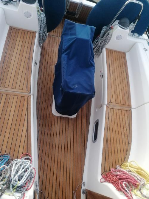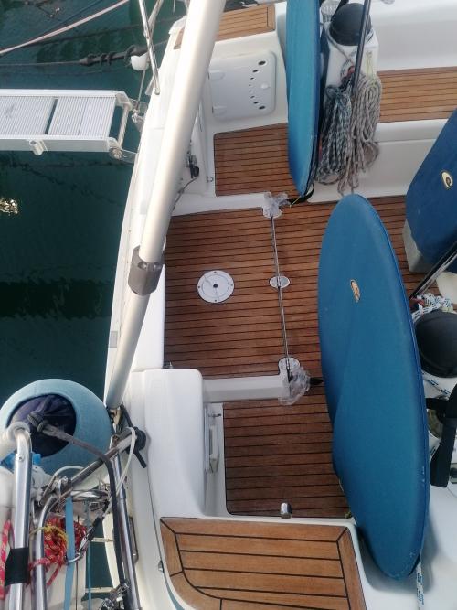 Punto forte il pozzetto, come si sale a bordo si percepisce la comodità, la razionalità, la protezione. Quest' ultima accentuata dallo sprayhood che si collega alla mastra rialzata e raccordata alla tuga. Ottimo anche il bimini a 4 archi veramente protettivo e dotato di due finestre semicircolari apribili per vedere la randa e il windex. Le panche sono molto lunghe e consentono di sdraiarsi comodamente. Tavolo centrale non troppo grande che non ostacola gli spostamenti durante le virate e supporta tutta la strumentazione. Si sta bene in pozzetto sia alla fonda sia in navigazione, cosa importante dato che si sta fuori nella maggior parte del tempo. Comode e con ottima visibilità sui filetti genoa le sedute, molto esterne, per il timoniere. La plancetta apribile con scaletta incorporata aumenta lo spazio utile ed é un comodo accesso al mare. Gli interni, come quasi tutti i Bavaria coevi di dimensioni simili sono accoglienti, comodi, luminosi, senza spigoli, con tientibene dove servono. Barca molto asciutta, senza odori, senza condensa interna. Ottima coibentazione della tuga e dello scafo.Nessuno scricchiolio proveniente dagli arredi in navigazione. In navigazione a motore la crociera economica a 2000 gm è a 7,3 nodi. Avendo più fretta si fanno 7,5 a 2100 e 7,7 a 2200 però con notevole appoppamento specie se in assetto di crociera con circa 500 kg tra serbatoi, fuoribordo, zattera tutti a poppa. Giri max 2700, oltre 8 nodi, solo per statistica. Come primo difetto non eliminabile direi la collocazione dei due grossi serbatoio acqua e gasolio sotto le cuccette di poppa anziché a centro barca. A vela: sempre un grande equilibrio e una piacevolezza al timone, sicuramente meglio che da nuovo grazie alla boccola superiore Jefa a rulli invece che a strisciamento come in origine. Andatura dove soffre é ovviamente la bolina con poco vento.Qui non c'e cruising code che tenga, se vuoi stringere lo devi fare con il Genoa. Come si hanno almeno 8 nodi di reale la barca parte bene e le nuove vele fanno bene il loro lavoro. Come si poggia un pò, con 10 nodi di reale su 60 gradi di apparente si va più veloci che a motore, tra i 7,4 e i 7,7 nodi con randa e Genoa. Il cruising code da 72 mq tira bene, ma bisogna evitare di stressarlo sopra i 12 nodi di apparente. Se sale o si poggia o si chiude. Ottimo il loop lungo con passanti e bozzello doppio con strozzatori Twin Cam della Selden per chiudere direttamente dal pozzetto. Il gennaker con calza lo abbiamo usato poco, forse per pigrizia. La trinchetta su strallo mobile provata solo una volta con 15 nodi per vedere come passare le scotte e le volanti. Scaricando bene la randa fino a 20 nodi di apparente si riesce a fare bolina stretta senza ridurre. Cmq i terzaroli si prendono bene anche grazie alle nuove borose da 10 mm in dyneema che scorrono meglio. Sorprendente come si vira meglio dopo essere passati dalle scotte Genoa in prestirato da 12 mm a quelle in Dyneema da 10 mm.Sotto pilota in funzione wind il comportamento é buono anche in bolina stretta, salvo che con vento leggero che salta spesso di direzione. Per il resto il Raymarine Evo 400 si é rivelato ottimo pilota come altrettanto valido il multi function Axiom collegato in rete e che usiamo quasi sempre su una scheramta di navigazione a vela con dati personalizzati.Ottimo anche l Ais 700 che da informazioni chiare sulla schermata cartografica. La barca appena si allarga l'andatura va portata piatta, usiamo molto il carrello randa e il vang quando necessario anche per ridurre il lavoro del pilota. Quindi unico difetto a vela la bolina con poco vento, la barca é pesante, non troppo invelata, con linee d'acqua non da racer. Già che siamo ai difetti direi che i winch primari sono inclinati in una posizione che rende un po scomodo usare la manovella, che i passavano sono troppo stretti, che il pozzo ancora e'piccolo in lunghezza ed é un problema lavorare a qualsiasi cosa sia al suo interno.Nella vita di rada ho avuto l'impressione di un brandeggio superiore a quello di altre barche. Però la linea di ancoraggio la abbiamo fatta bene ed é pienamente soddisfacente, così come la produzione energetica tramite i tre pannelli solari ed anche l'autonomia idrica. Comoda la doccia calda in pozzetto che si mantiene a buona temperatura anche il giorno dopo lo spegnimento del motore. Le modifiche all impiantistica si sono rivelate centrate, ridotto consumo del frigo e delle lampade full LED, ottima la coibentazione e l' estrazione aria vano motore, valvole prese e scarichi a mare sempre morbide. Autoclave sostituito ma cmq rumoroso se ci si trova nel bagno di poppa.