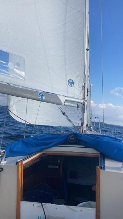 a paratia si vede poco e male, visto che basta che ci sia qualcuno in pozzetto perché vada in copertura, e perché essendo una barca di 8 metri per 2, a chiglia lunga, sbanda subito moltissimo creando ancora più opportunità di copertura