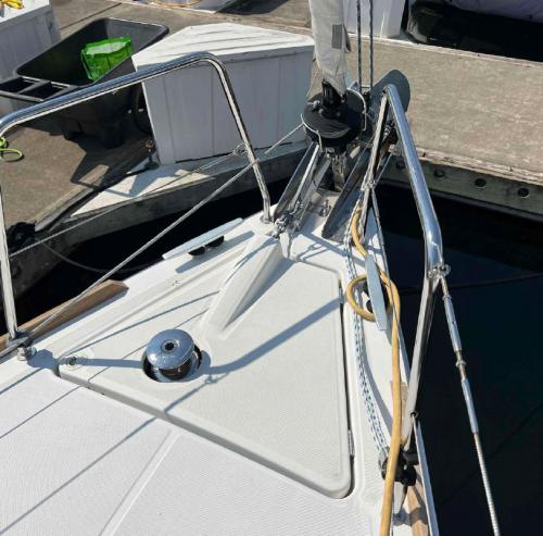 L'ammainata la farei sempre al lasco con randa bella lasca, e così a senso direi pure con scotta ben cazzata, in modo che se siete rapidi il Code cade a bordo per gravità, uno a prua che lo recupera velocemente prendendolo per la balumina per tenerlo nella sagoma del ponte ed il gioco è fatto. Ma ripeto.. non l'ho mai fatto, prova con poco vento prima!